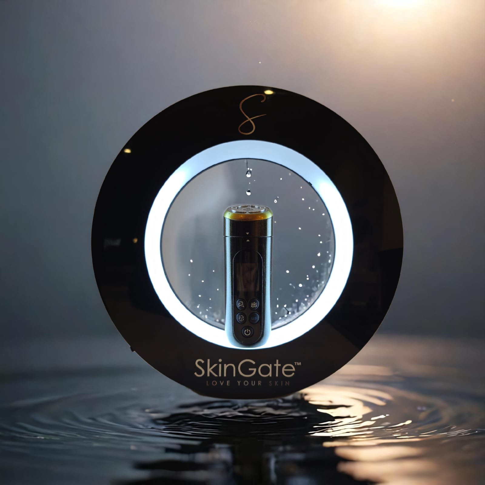 SkinGate is a proprietary multi modal skincare delivery system designed to enhance the absorption and efficacy of active ingredients through a combination of advanced technologies, including real time skin analysis, controlled thermal activation, dual wavelength LED phototherapy, and iontophoretic infusion. The device is designed to transform everyday skincare into a clinically inspired, at home treatment experience.
